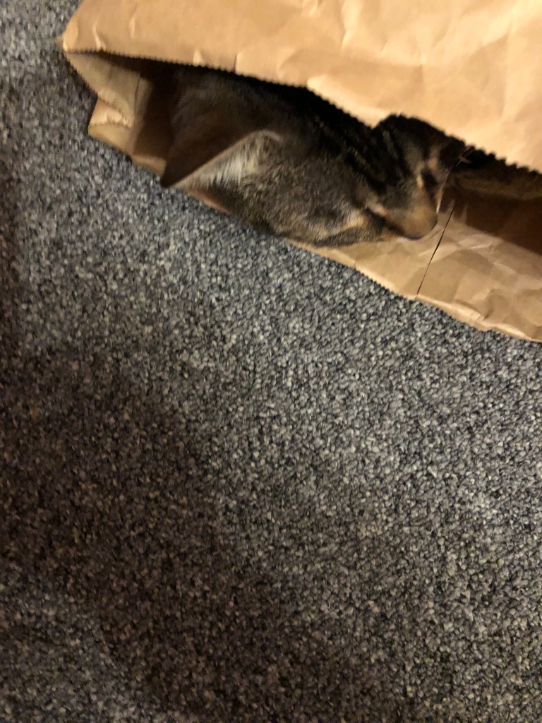 After breakfast, I drove back to Forest Hills, where I parked inside. I then helped Elliot with moving items out of the kitchen in anticipation of the upcoming remodeling. So now everything is parked in the living room; the area is chock full of kitchen hardware. We even had to move Jocelyn’s litter box since our contractor needs the kitchen free of any protuberances. We’re waiting to see if she adjusts to the change. You know how cats are with change! They are creatures of habit primarily. Elliot just introduced Jocelyn to the litter box’s new location and the rest, as they say, is in the bag. In fact, Jocelyn is resting in a brown paper bag right now, if you need to know.