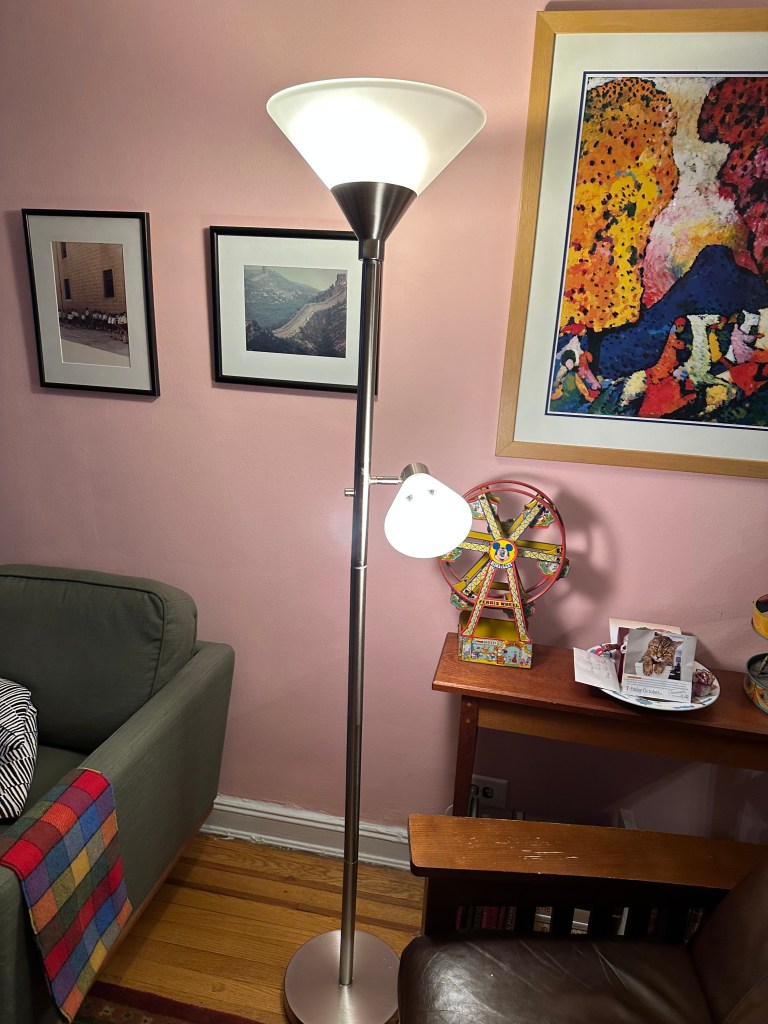 Anyway, the highlight of our day today was assembling our brushed nickel torchiere lamp after my return from having breakfast at Jackson Hole before 12. The biggest struggle with the lamp was removing it from the cocoon of styrofoam that encased the various parts. After some pulling, I finally removed the contents of the lamp and started putting it together. Elliot came in and assisted me with some of the effort. After some exertion, we got the lamp to stand and positioned it where the old lamp stood. I took three 60W bulbs and placed them in the light sockets and turned on the switch – and, voila, light. Now if I could just put together an outside barbecue grill, now that would be something. But we really wouldn’t need one since we don’t have a terrace or a house. I have to think of something else to assemble without freaking out and calling a handyman to finish the job.