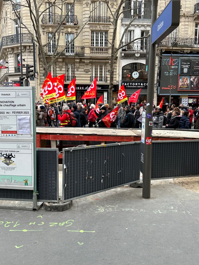 This is the CGT (General Confederation of Labour), a national trade union, that is demonstrating in the street. This was founded in the city of Limoges in 1895. It is the first of the five major French confederations of trade unions.