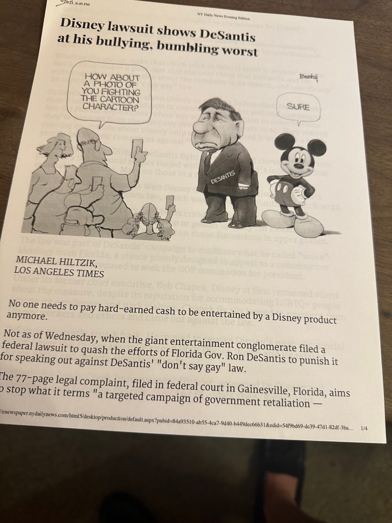 Speaking about another Dumpf Mini-Me, Ron “DeSant-ASS,” I direct your attention to the newest development in the latest spat between the Florida fascistic governor and his war with the largest employer in the state, the Walt Disney Company, that has now filed a lawsuit against the Fred Flintstone governor. An article that appears in the late edition of the Daily News by Michael Hiltzik of the Los Angeles Times entitled “Disney lawsuit shows DeSantis at his bullying, bumbling worst.”