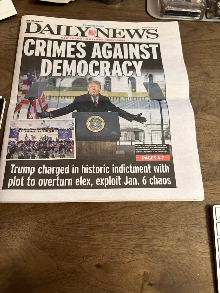 In the meantime, I bought two copies of The New York Times – to keep one for its front-page-spanning headline – and a copy of the Daily News for its headline “Crimes Against Democracy” with a picture of the alleged criminal making his insurrection-spurring speech at the Ellipse – with his outstretched small hands in leather gloves. You know the picture by now!