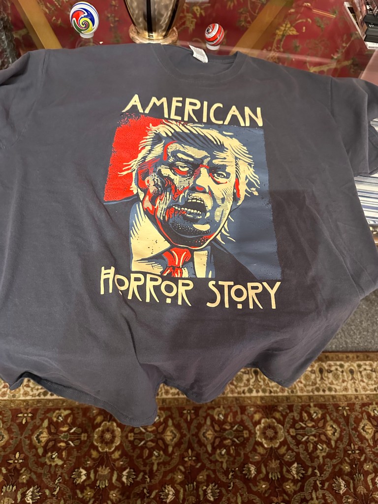 I also wanted to say that two days ago, we saw our good friend “Gene” before he leaves the borough of Queens for Provincetown for good. As we were sitting in his bare kitchen, he gifted us with three large T-shirts that his late husband had: two of Barack Obama and his two election campaigns and one dubbed “American Horror Story” with the visage of Donald Trump between the word “American” and “Horror Story.” Strangely enough, I originally thought the face was that of Albert Einstein before I understood the true message behind this scathing denunciation of the twice-impeached, four-times indicted former president. The face of the former president appears very distorted at first, so that’s why I couldn’t identify him right away. Now I have to decide if I can truly wear it in public. Even though I did wear an anti-MAGA hat during Dumpf’s four years in office. Barring a few verbal scrapes with strangers who misread the words on the brim of the hat, I didn’t experience any blows to my body by MAGA loyalists or anyone else for that matter. But let’s see with this T-shirt.