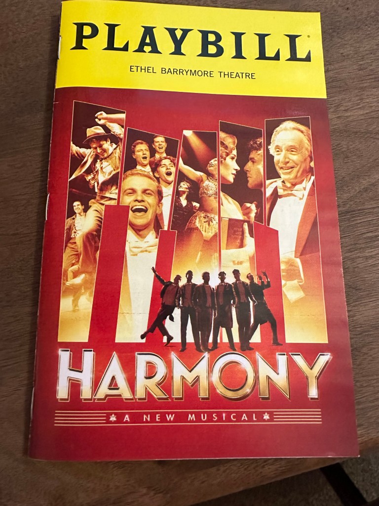 For my birthday yesterday, Elliot and I were treated to a fairly new play on Broadway called Harmony which was written by pop star Barry Manilow and Bruce Sussman. The tickets were bought for us by Elliot’s cousin in Scottsdale, “Joan.” We were very eager to see this new play that centers on the real-life exploits and tragedy of a vocal sextet called the Comedian Harmonists who were huge in Germany in the 20s and early 30s until the Nazis came to power and shut them down. I can’t stress enough how relevant this play is in today’s charged environment.