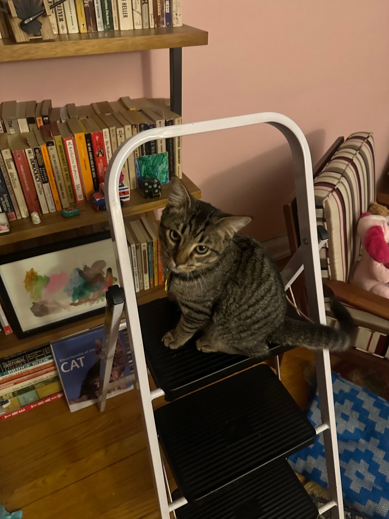 Last night I found Atticus on the top step of this step stool. I waved him down, of course.