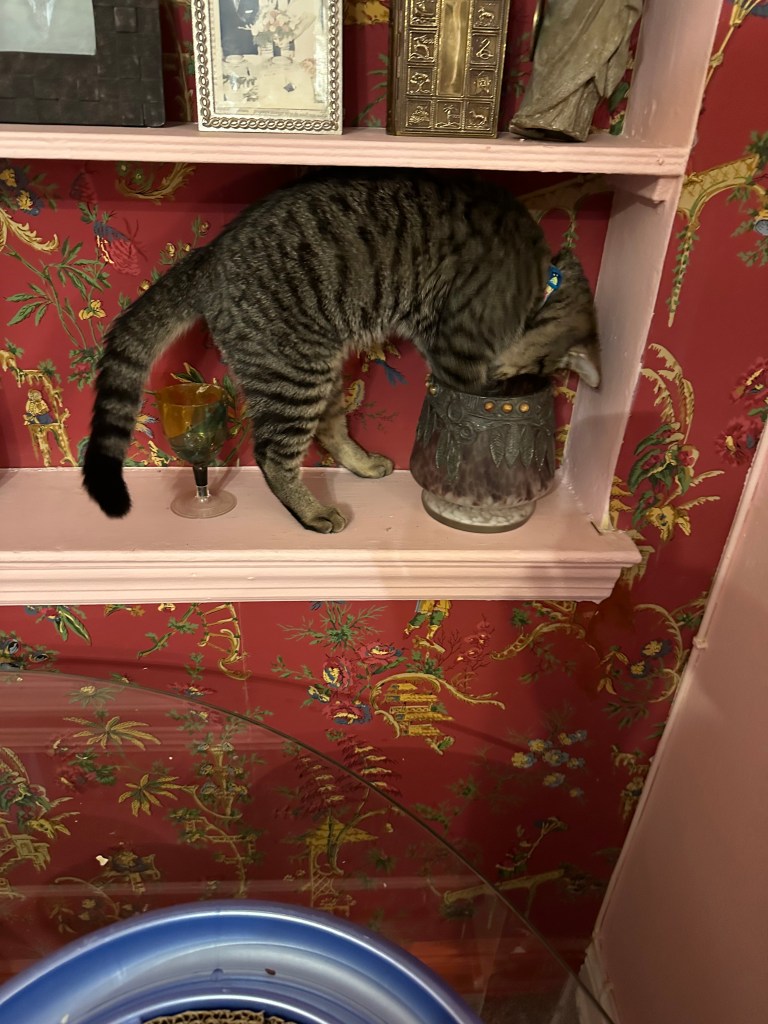 Here is Atticus peering into that vase looking for something to take out. Atticus’s old turbo scratcher toy is on the dining room table.