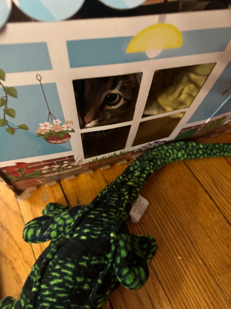 Ooh, what big eyes you have there! Here’s Atticus staring at a stuffed alligator in his new paper doll house that we found downstairs in the basement of our building. He seems to like it.