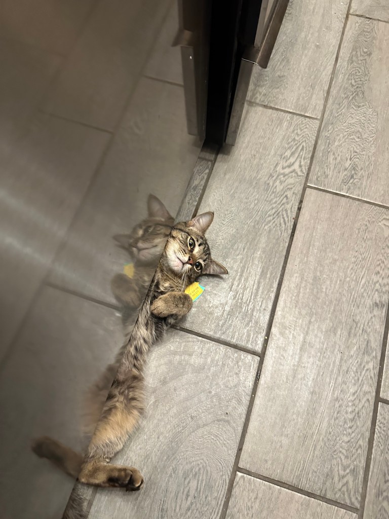 Here Atticus is scrunched once more under the dishwasher for some reason only known to himself.