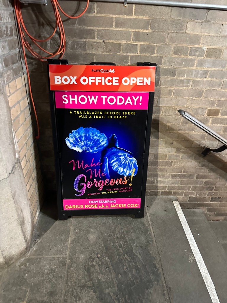 The play I eventually decided to see was Make Me Gorgeous! playing at Playhouse 46 at St. Luke’s, on West 46th Street. I don’t believe I’ve ever seen a production there before last night. I heard about this play just yesterday morning and it piqued my interest. And the price was indeed right: only $46. The theater was small and not your average Broadway theater like the Helen Hayes.