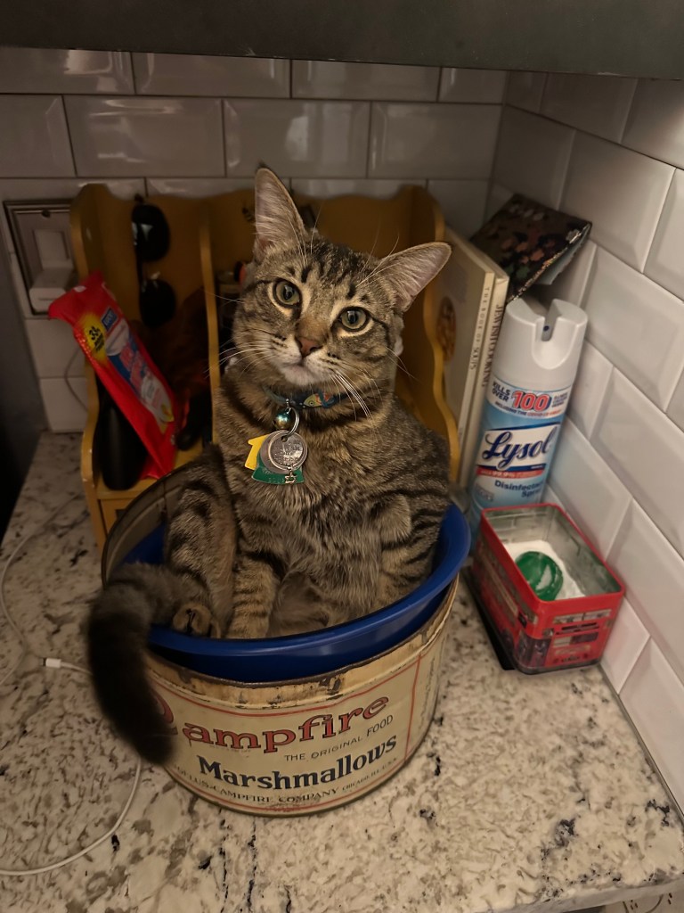 Here Atticus is sitting on a blue bowl under a Campfire marshmallow box. Isn’t he sooo cute?