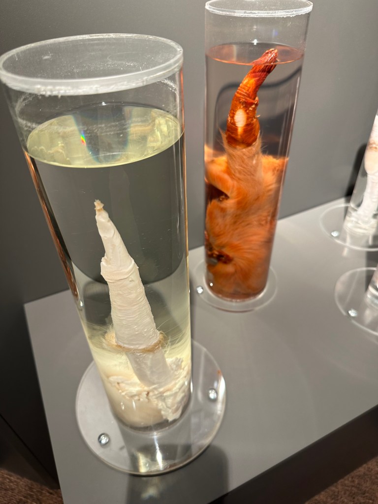 Some highlights of our stay in the city were going to the National Museum of Iceland which told the history of the country from the founding of Iceland from 870-930 CE, its conversion to Christianity around A.D. 1000, and had Viking treasures and artifacts, wood carvings, and some unusual whalebone carvings, as well as maritime objects, historical textiles, jewelry, and craft objects, At the museum, I learned of the name of the original Nordic settler to the country whose name was Ingolfur Arnarson. But what truly amazed Elliot and me in all of our museum going was visiting the one and only repository of its kind in the world, the Icelandic Phallological Museum, commonly known as the “penis museum.” This iconic museum, located near the harbor area, is dedicated to the male genitalia of mammals from around the world. The museum supposedly houses 280 specimens from 93 different species, according to Fodor’s Travel guide of Essential Iceland. In fact, there were so many specimens preserved in formalin that I was getting dizzy from seeing so many of these mammalian genitals. Of course, I took some choice pics of these preserved genitalia for your edification.