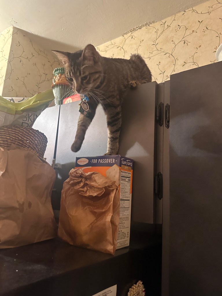 Here is Atticus bending down to grab some bags on top of the refrigerator. It’s time to take these attractive baubles away from his grasp.