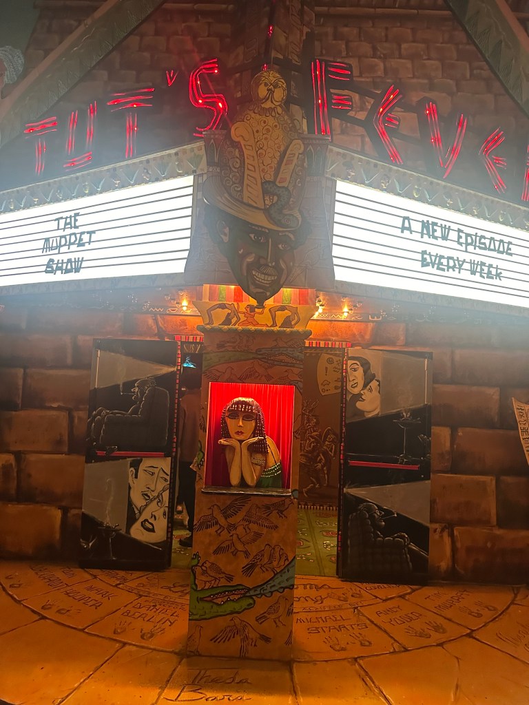This is a replica of an Egyptian-style movie house that still shows various short films. Yesterday a Muppets episode from the TV show was broadcast, starring the late country-western star Roy Clark as their guest.