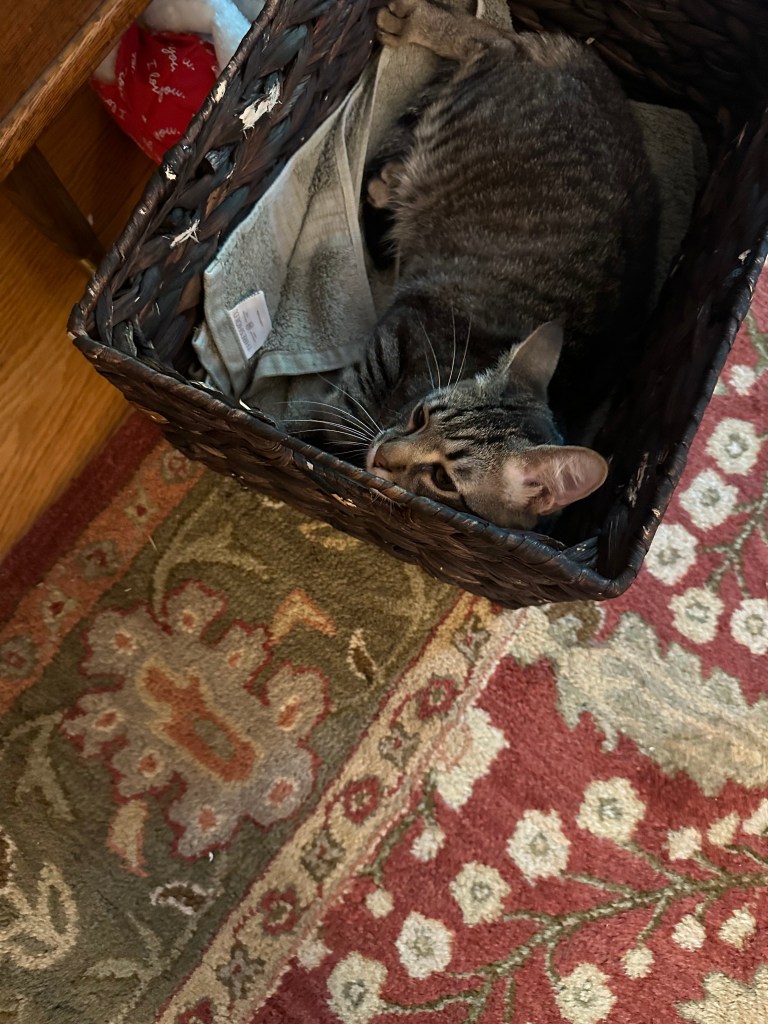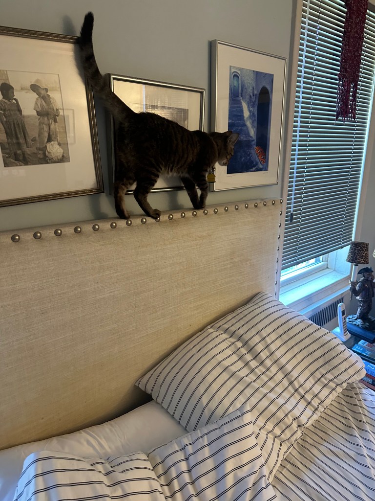 I finally got a shot of Atticus walking across our headboard this morning. Sorry, I didn’t make the bed then.