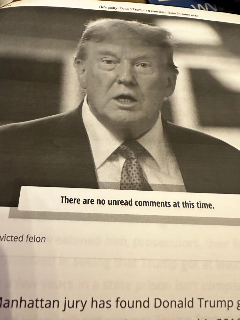 Today is Thursday, May 30, 2024. Well, folks, the verdict is in! I got my wish and Donald J. Duck has been found guilty on all 34 felony counts in New York. I was watching MSNBC when Ari Melber read all the guilty votes for the former president who now becomes the first commander in chief found guilty on 34 felony counts. I couldn’t believe my ears when all counts Melber read were “guilty.” I didn’t expect such an outcome; I expected Drumpf to receive some “not guiltys,” but I was proved wrong with this unanimous verdict. I then shouted “guilty” myself through the window. I believe this recitation of guilty verdicts came in around 4:40 p.m. So this was quite a momentous day for the rule of law right here in my hometown, New York.