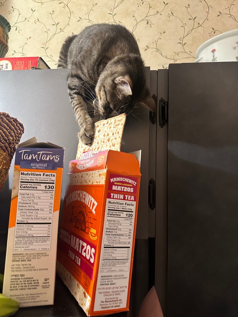 Here is Atticus trying to snatch a piece of matzoh from the box while lying on top of the refrigerator. I din’t know he was Jewish.
