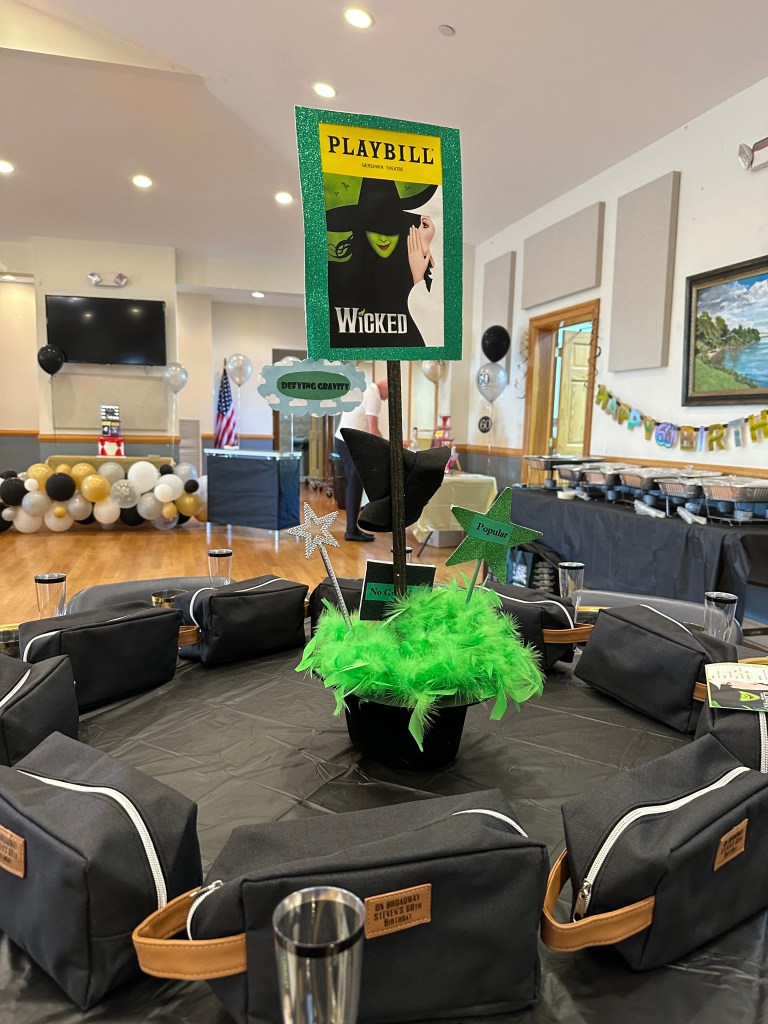 Here is our Wicked table. The circle of black toiletry bags constituted the favors given to everyone. Inside were travel-size items you would take on a trip like toothpaste, conditioning shampoo, safety razors, toothbrush, and deodorant soap.
