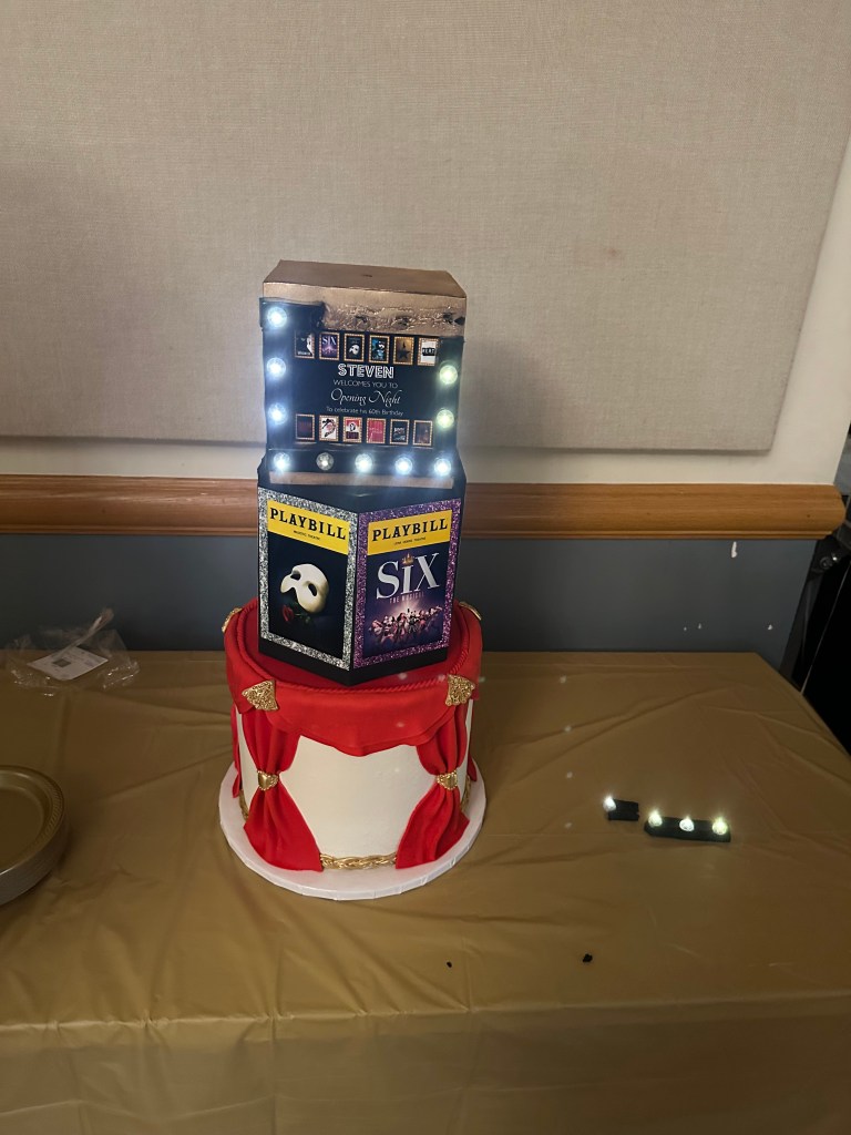 That blessing notwithstanding, Elliot and I still enjoyed ourselves for the most part. I would say that we stayed about three hours and fifteen minutes, so by 9:15 we started saying our good-byes. The cake was quite unique: there was a lighted sign on top of the cake with words to the effect that “‘Seth’ Welcomes you to Opening Night to Celebrate his 60th Birthday.” Under that was a turntable with posters from various plays that Seth has obviously seen since he’s such a Broadway fanatic. That turntable sat on top of the cake which was in the form of a red curtain. Very creative, to say the least. The cake actually tasted good too.