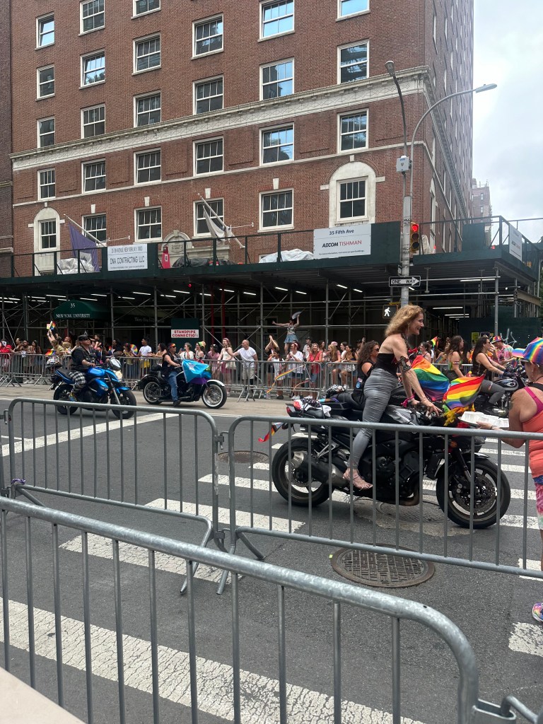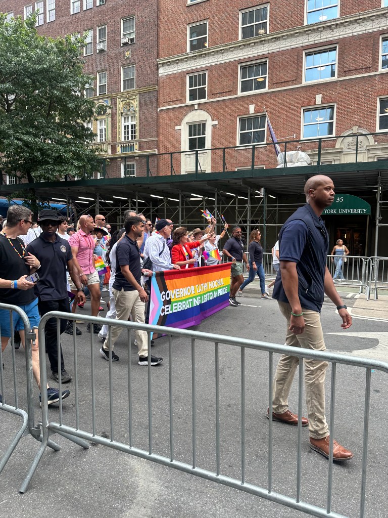 My friend arrived around 11:45, which was fine by me since I called my friend “Gene” who is in Provincetown now while I was standing at the barricade watching the dignitaries parade by. I saw Governor Kathy Hochul, Mayor Eric Adams, Attorney General Letitia James, Senate Majority Leader Chuck Schumer (later), and Rep. Jerold Nadler (also at a later point). This list represented the most politicians I’ve seen at a Pride March or at any other parade. They all walked before 12, probably to get out of the way of the real proceedings meant to start at 12. Eventually, I took trays of water up into the line of fire, so to speak, and cheerily announced, “Water, water; who wants water?” I got to see more of the march this time than ever before since I’ve always been a spectator, not someone standing in the street with the marchers. So it was quite a thrill for me this year. My friend and I stood for about 4 hours and then called it a day. We left the area around 3 p.m.