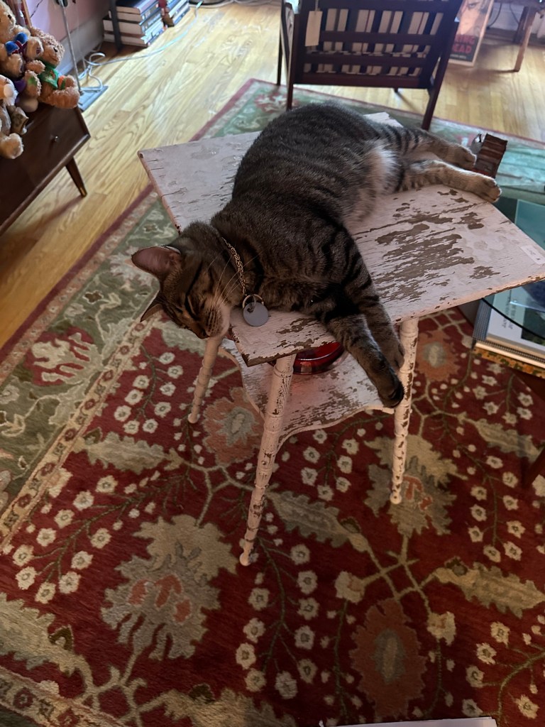 Here’s Atticus resting on a table I bought in Sullivan County in May right before Memorial Day.