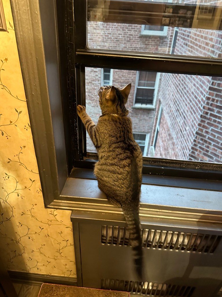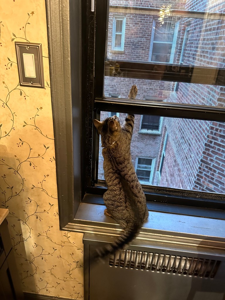 Maybe here he sees something on the window. Possibly a fruit fly or something akin to that.