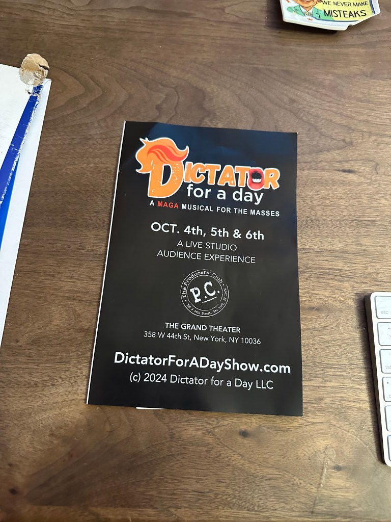Today is Sunday, October 6, 2024. Today I was in the audience at the Grand Theater, on West 44th Street, cheering on the creation of good friend Rich Herschlag’s production called Dictator for a Day in which he provided the music, lyrics, and prerecorded songs for this musical romp through the life of former president Donald Duck. The subheading for this satire is A MAGA Musical for the Masses. This one- hour-twenty-minute opus to insanity in the form of the former president boasts a strong performance by J-L Cauvin as Donald Trump, Rory Scholl as a singing Donald Trump, and Sammy “The Deuce” Kassin in various roles: Bernie Sanders, Mark Albert, Vinnie from Brooklyn and even TV’s Lieutenant Columbo.