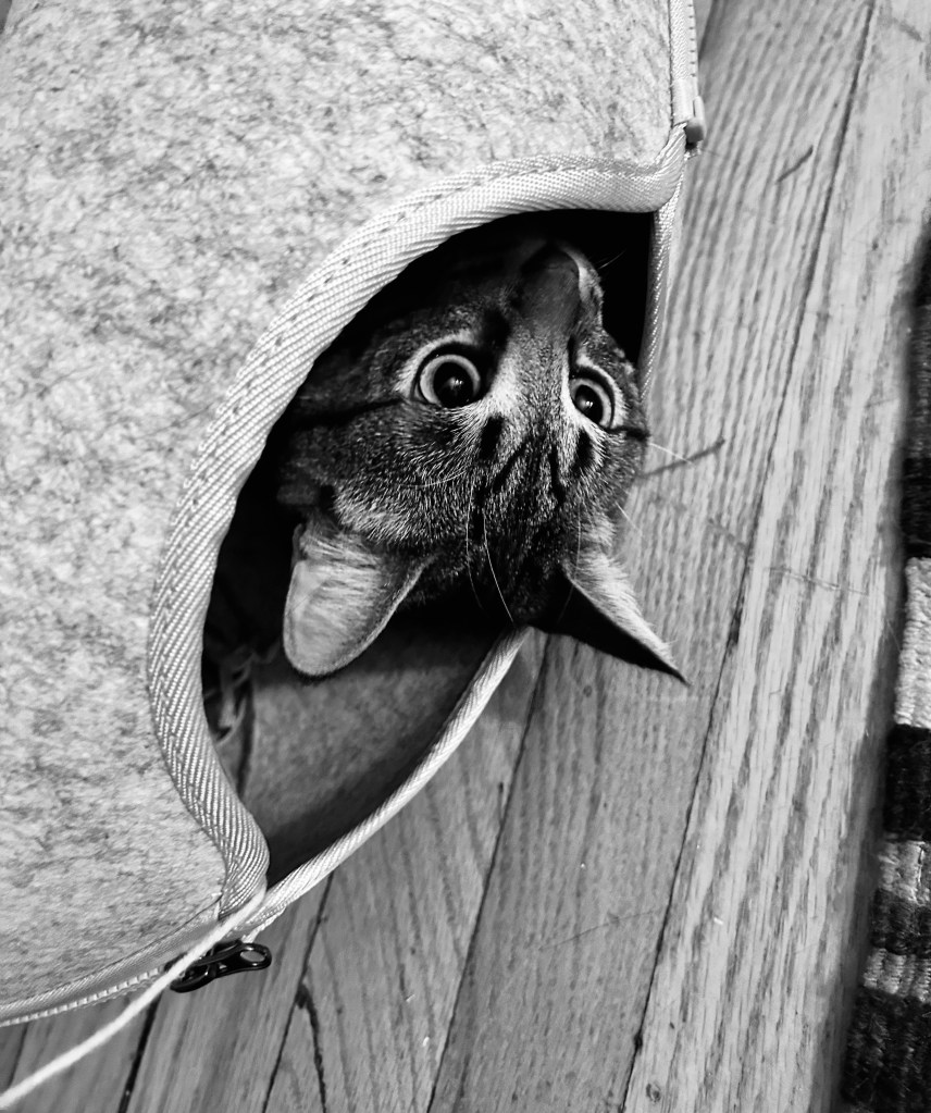 Here’s a black-and-white photo of the scamp sitting in a toy that our sitter gave us.