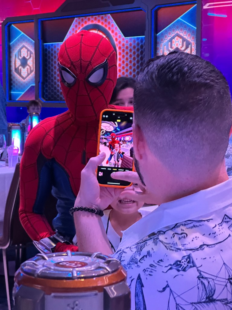 Here is Spider-Man making an appearance during dinner at Worlds of Marvel restaurant. Here we saw Paul Rudd as Ant-Man and Evangeline Lilly as the Wasp speak to the audience from a large wide screen as they interacted with diners.