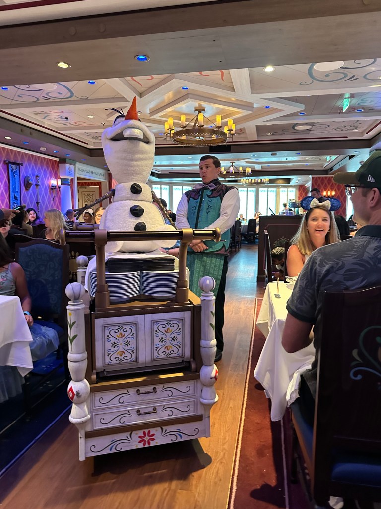 On the last night of the cruise, all of us celebrated “Joshua’s” birthday in a cool Disney restaurant: Arendelle: A Frozen Dining Adventure, which featured characters from the film and play Frozen (which I was unfamiliar with, of course) staging a show right in front of us since our table faced the stage in the middle of the eatery. The waitstaff came around to sing “Happy Birthday” to Joshua who winced at all of the attention.