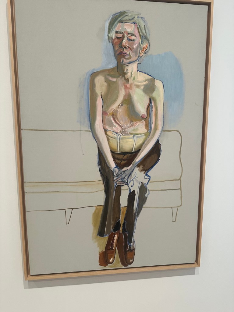 Can you guess who this once-famous public figure is? If you guessed Andy Warhol, you’re correct. Here the artist who painted this is Alice Neel, and the painting is aptly called Andy Warhol. The Pop artist’s vulnerability is shown here by Neel who depicts him with his scars and corset that he wore after being shot in 1968.